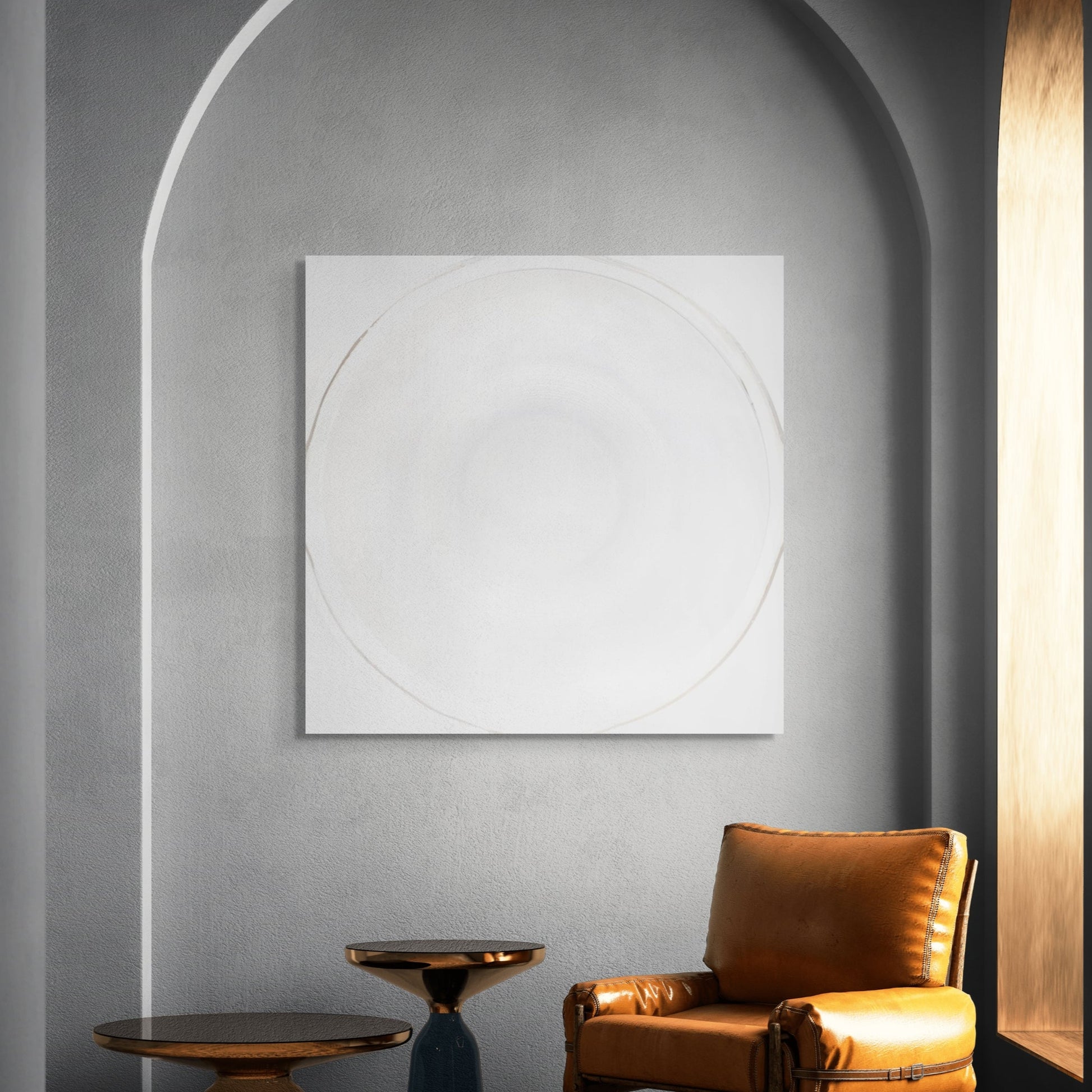 Arc is a divinely inspired work featuring a pure white mindfulness circle with a delicate hint of gold on a square canvas. This piece exudes calm and elegance, making it a refined addition that enhances any sophisticated setting with subtle spiritual grace.